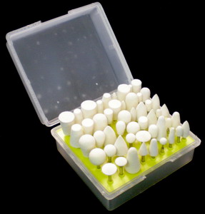 Filzpolierkörper in profilierter Form aus hartem, komprimiertem Spezialfilz. Verschiedene Formen, um z.B. Sacklöcher oder andere konkave Formen in Glas oder andren harten Materialienzu polieren. Es wir dazu noch ein Poliermittel, z.B. Diamantpaste, benötigt.