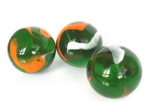 Glas-Murmel von ca. 35mm aus hellgrünem Klarglas mit oranger und weißopaler Marmorierungen versehen.