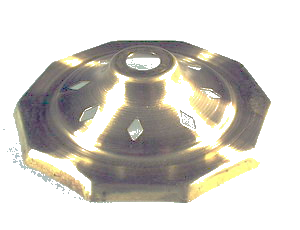perforierte, rautenförmig durchbrochene 10-eck-Kappe aus Messing ca. 2,5cm Kantenlänge. Eventuell vor der Verwendung der zehneckigen Endkappe in einer Tiffanylampe, diese komplett verzinnen - dann kann der 10-eckige Messingdeckel später leichter in der Farbe der Lötnähte patiniert werden.