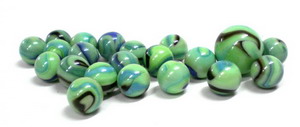 grünopake Glasmurmeln mit Bändern in hellblau, dunkelblau und braun. Im Netz oder Beutel sind ein kompletter Murmelsatz mit 20 Stück von ca. 16mm und einem Stück von ca. 25mm Durchmesser.