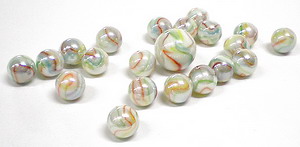 weissopakes Glasmurmelset mit Bändern in vielen zarten Farben - glänzend. Ein außerordentlich schönes Murmelset ! Im Netz oder Beutel sind ein kompletter Murmelsatz mit 20 Stück von ca. 16mm und einem Stück von ca. 25mm Durchmesser. Schöne Qualität aus Mexico - nicht aus China!