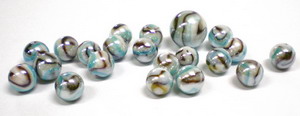 weissopake Glasmurmeln mit Bändern in eisblau und braun. Im Netz oder Beutel sind ein kompletter Murmelsatz mit 20 Stück von ca. 16mm und einem Stück von ca. 25mm Durchmesser. Schöne Qualität aus Mexico - nicht aus China!