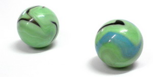 Riesen-Murmel von ca 42mm aus hellgrünem, opakem Glas mit hellblauen und dunkelbraunen Marmorierungen versehen.