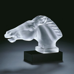 Pferdekopf im Stil des Art Deco, aus fein mattiertem Bleikristallglas auf schwarzem Sockel. Eignet sich auch gut als hochwertige Trophäe etc.