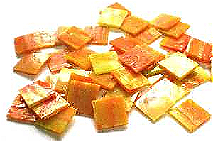 Tiffanyglas, von Hand in leicht unregelmäßige Quadrate geschnitten. Problemlos in kleinere Steinchen zu spalten. Schönes Gelb mit rot marmoriert, recht dicht, zu einem sehr günstigen Preis.