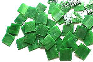 Tiffanyglas, von Hand in leicht unregelmäßige Quadrate geschnitten. Problemlos in kleinere Steinchen zu spalten. Schönes Grün zu einem sehr günstigen Preis.