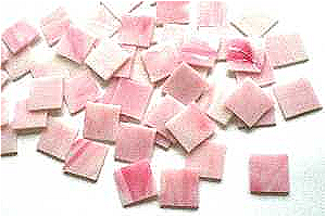 Tiffanyglas, von Hand in leicht unregelmäßige Quadrate geschnitten. Problemlos in kleinere Steinchen zu spalten. Schönes Pink zu einem sehr günstigen Preis.