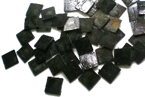 Tiffanyglas, von Hand in leicht unregelmäßige Quadrate geschnitten. Problemlos in kleinere Steinchen zu spalten. Schwarze Mosaiksteinchen zu einem sehr günstigen Preis.