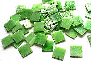 Tiffanyglas, von Hand in leicht unregelmäßige Quadrate geschnitten. Problemlos in kleinere Steinchen zu spalten. Schönes Waldfrün zu einem sehr günstigen Preis.