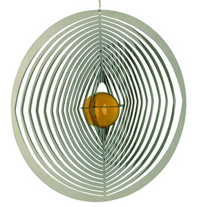 wunderschönes Windspiel in runder Form mit gelber Glaskugel in der Mitte.